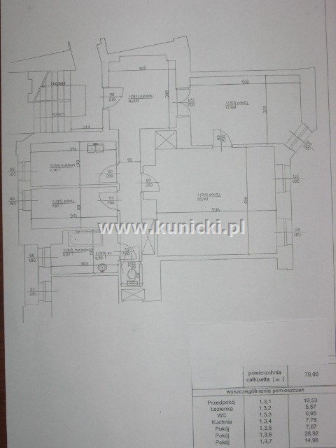 Omawiane mieszkanie składa się z trzech pokoi o zróżnicowanym metrażu: 27m2, 15m2 i 7m2, widnej, oddzielnej kuchni 7,8m2, widnej łazienki 7,5m2 oraz przedpokoju 16,5m2. Wysokość pomieszczeń wynosi 3,2m, ekspozycja okien jest na stronę południową i północną. Lokal jest nieumeblowany, ale może być doposażony przez właściciela. Kuchnia i łazienka są w pełni wyposażone. Z jednej strony (lokalu) są rolety antywłamaniowe i jest zainstalowany alarm. Mieszkanie przeszło remont ok. 12 lat temu, w roku 2016 zostało odnowione. W lokalu została wymieniona instalacja elektryczna w roku 1999. W roku 2001 zostały wymienione okna. W budynku wymieniono instalację wodno-kanalizacyjną oraz wyremontowano elewację i dach (2006r.).